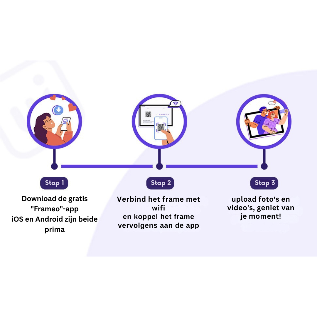 Verbind de fotolijst met de Frameo App op je smartphone of tablet om eenvoudig foto's en korte video's te delen. Zo blijft je familie verbonden, waar ze ook zijn.