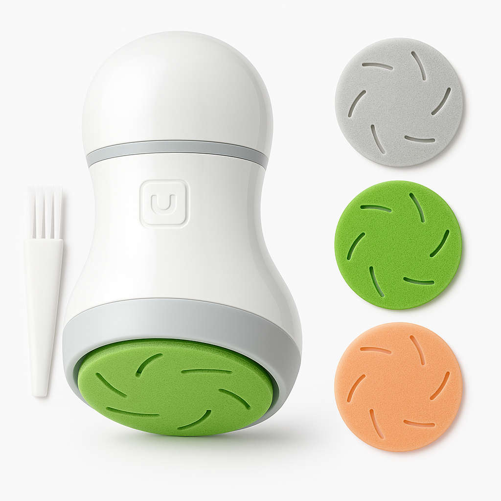 Meegeleverd: 3 vervangbare slijpschijven (grijs, groen, oranje) + reinigingsborstel