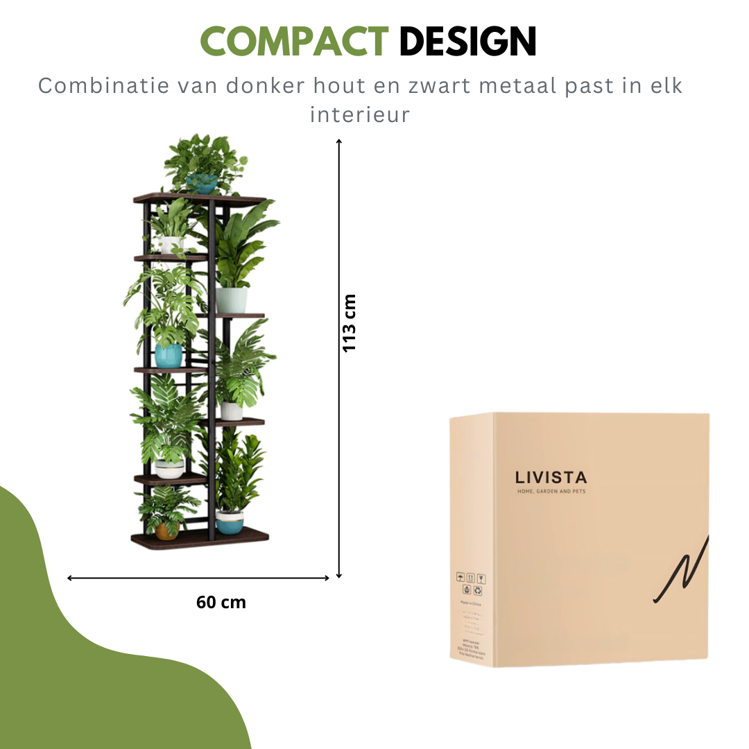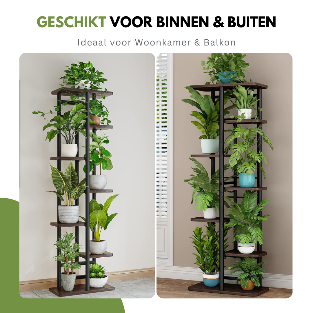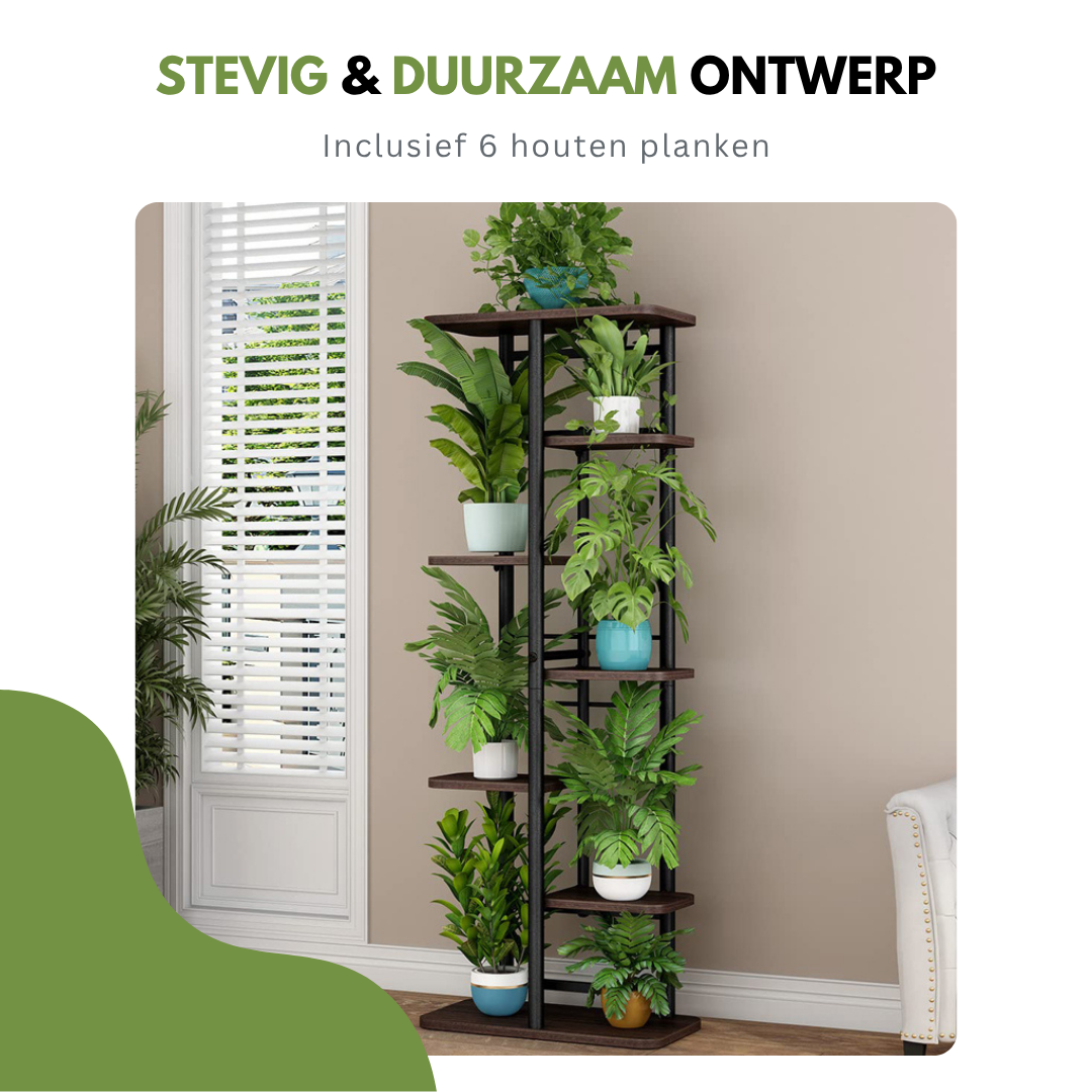 Het stevige metalen frame gecombineerd met hoogwaardige houten planken zorgt voor stabiliteit én een luxe uitstraling. De open indeling biedt elke plant voldoende licht, waardoor jouw groene collectie optimaal tot zijn recht komt.
